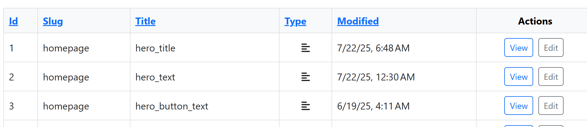 A CMS was created to allow the static content of the site to be changed, such as the homepage text, images, and links. This was done so that the code doesn't need to be changed to keep the site fresh. A Contents table was created to hold all of these fields, with one row for each unique part (about me title, about me text, ...).